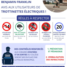 Avis aux utilisateurs de trottinettes électriques. Depuis plusieurs semaines, des comportements dangereux liés à l’utilisation de trottinettes sont constatés aux abords du collège Benjamin Franklin : vitesse excessive, plusieurs enfants sur un même engin, absence de casque, circulation sur les trottoirs.